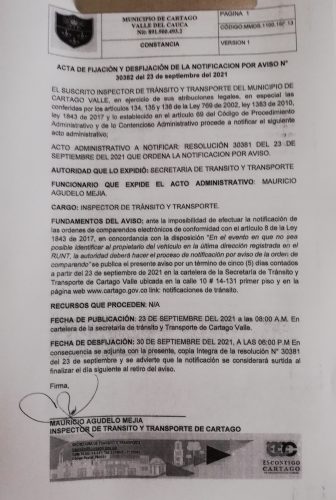 Notificaciones de TransitoNotificaciones de Transito 2021 Resolución No. 30381 Por Transito - 23 septiembre, 2021 0 850 FacebookTwitterPinterestWhatsApp ACTA DE FIJACION Y DESFIJACION DEL AVISO COMPARENDOS 2021Descarga NOTIFICACION POR AVISO N 30382 DEL 23 DE SEPTIEMBRE DEL 2021Descarga RESOLUCION N 30381 DEL 23 DE SEPTIEMBRE DEL 2021 QUE ORDENA LA NOTIFICACION POR AVISODescarga dav