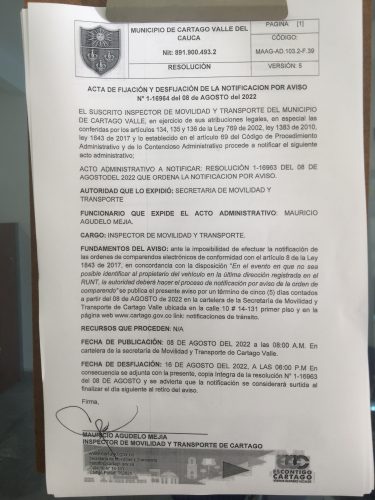 Notificaciones de TransitoNotificaciones de Transito 2022 Resolución No. 1-16963 Por Transito - 10 agosto, 2022 0 622 FacebookTwitterPinterestWhatsApp ACTA DE FIJACION Y DESFIJACION DEL AVISO COMPARENDOS 2022Descarga NOTIFICACION POR AVISO No. 1-16964 DEL 08 DE JULIO DEL 2022Descarga RESOLUCION No. 1-16963 DEL 08 DE JULIO DEL 2022 QUE ORDENA LA NOTIFICACION POR AVISODescarga