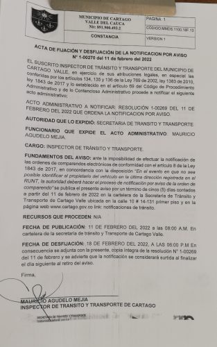 Notificaciones de TransitoNotificaciones de Transito 2022 Resolución No. 1-00269 Por Transito - 11 febrero, 2022 0 784 FacebookTwitterPinterestWhatsApp ACTA DE FIJACION Y DESFIJACION DEL AVISO COMPARENDOS 2022Descarga NOTIFICACION POR AVISO N 1-00270 DEL 11 DE FEBRERO DEL 2022Descarga RESOLUCION N 1-00269 DEL 11 DE FEBRERO DEL 2022 QUE ORDENA LA NOTIFICACION POR AVISODescarga dav