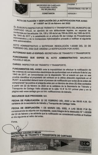 Notificaciones de TransitoNotificaciones de Transito 2022 Resolución No. 1-00306 Por Transito - 22 febrero, 2022 0 800 FacebookTwitterPinterestWhatsApp ACTA DE FIJACION Y DESFIJACION DEL AVISO COMPARENDOS 2022Descarga NOTIFICACION POR AVISO N 1-00307 DEL 22 DE FEBRERO DEL 2022Descarga RESOLUCION N 1-00306 DEL 22 DE FEBRERO DEL 2022 QUE ORDENA LA NOTIFICACION POR AVISODescarga dav