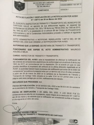 Notificaciones de TransitoNotificaciones de Transito 2022 Resolución No. 1-08712 Por Transito - 28 marzo, 2022 0 943 FacebookTwitterPinterestWhatsApp ACTA DE FIJACION Y DESFIJACION DEL AVISO COMPARENDOS 2022Descarga NOTIFICACION POR AVISO No. 1-08713 DEL 28 DE MARZO DEL 2022Descarga RESOLUCION No. 1-08712 DEL 28 DE MARZO DEL 2022 QUE ORDENA LA NOTIFICACION POR AVISODescarga
