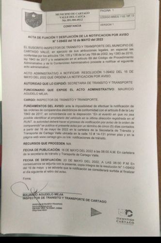 Notificaciones de TransitoNotificaciones de Transito 2022 Resolución No. 1-09402 Por Transito - 16 mayo, 2022 0 764 FacebookTwitterPinterestWhatsApp ACTA DE FIJACION Y DESFIJACION DEL AVISO COMPARENDOS 2022Descarga NOTIFICACION POR AVISO No. 1-09403 DEL 16 DE ABRIL DEL 2022Descarga RESOLUCION No. 1-09402 DEL 16 DE ABRIL DEL 2022 QUE ORDENA LA NOTIFICACION POR AVISODescarga