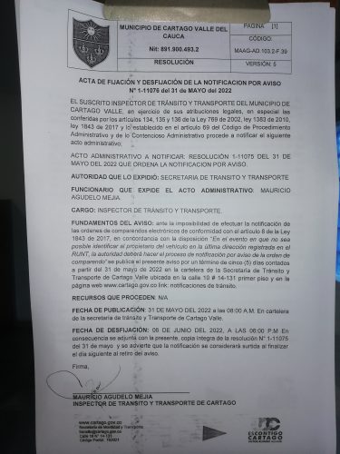 Notificaciones de TransitoNotificaciones de Transito 2022 Resolución No. 1-11075 Por Transito - 31 mayo, 2022 0 691 FacebookTwitterPinterestWhatsApp ACTA DE FIJACION Y DESFIJACION DEL AVISO COMPARENDOS 2022Descarga NOTIFICACION POR AVISO No. 1-11076 DEL 31 DE MAYO DEL 2022Descarga RESOLUCION No. 1-11075 DEL 31 DE MAYO DEL 2022 QUE ORDENA LA NOTIFICACION POR AVISODescarga
