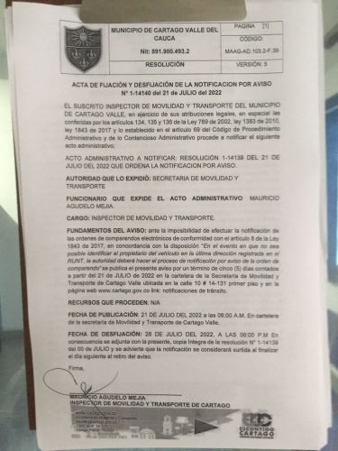 Notificaciones de TransitoNotificaciones de Transito 2022 Resolución No. 1-14139 Por Transito - 21 julio, 2022 0 668 FacebookTwitterPinterestWhatsApp ACTA DE FIJACION Y DESFIJACION DEL AVISO COMPARENDOS 2022Descarga NOTIFICACION POR AVISO No. 1-14140 DEL 21 DE JULIO DEL 2022Descarga RESOLUCION No. 1-14139 DEL 21 DE JULIO DEL 2022 QUE ORDENA LA NOTIFICACION POR AVISODescarga