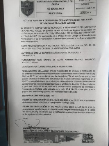 Notificaciones de TransitoNotificaciones de Transito 2022 Resolución No. 1-14153 Por Transito - 25 julio, 2022 0 698 FacebookTwitterPinterestWhatsApp ACTA DE FIJACION Y DESFIJACION DEL AVISO COMPARENDOS 2022Descarga NOTIFICACION POR AVISO No. 1-14154 DEL 25 DE JULIO DEL 2022Descarga RESOLUCION No. 1-14153 DEL 25 DE JULIO DEL 2022 QUE ORDENA LA NOTIFICACION POR AVISODescarga