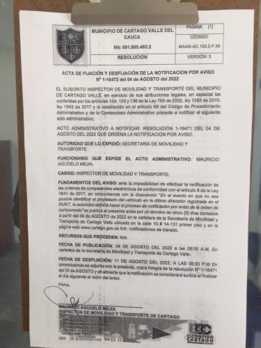 Notificaciones de TransitoNotificaciones de Transito 2022 Resolución No. 1-16471 Por Transito - 4 agosto, 2022 0 702 FacebookTwitterPinterestWhatsApp ACTA DE FIJACION Y DESFIJACION DEL AVISO COMPARENDOS 2022Descarga NOTIFICACION POR AVISO No. 1-16472 DEL 04 DE JULIO DEL 2022Descarga RESOLUCION No. 1-16471 DEL 04 DE JULIO DEL 2022 QUE ORDENA LA NOTIFICACION POR AVISODescarga