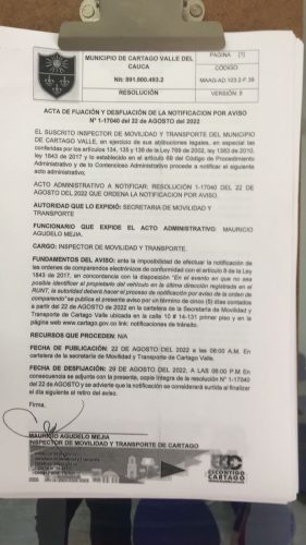 Notificaciones de TransitoNotificaciones de Transito 2022 Resolución No. 1-17040 Por Transito - 22 agosto, 2022 0 704 FacebookTwitterPinterestWhatsApp ACTA DE FIJACION Y DESFIJACION DEL AVISO COMPARENDOS 2022Descarga NOTIFICACION POR AVISO No. 1-17041 DEL 22 DE AGOSTO DEL 2022Descarga RESOLUCION No. 1-17040 DEL 22 DE AGOSTO DEL 2022 QUE ORDENA LA NOTIFICACION POR AVISODescarga