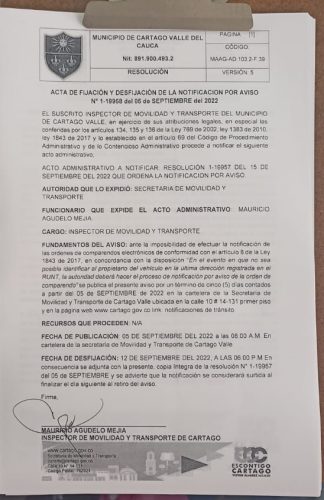 Notificaciones de TransitoNotificaciones de Transito 2022 Resolución No. 1-19957 Por Transito - 5 septiembre, 2022 0 690 FacebookTwitterPinterestWhatsApp ACTA DE FIJACION Y DESFIJACION DEL AVISO COMPARENDOS 2022Descarga NOTIFICACION POR AVISO No. 1-19958 DEL 05 DE SEPTIEMBRE DEL 2022Descarga RESOLUCION No. 1-19957 DEL 05 DE SEPTIEMBRE DEL 2022 QUE ORDENA LA NOTIFICACION POR AVISODescarga