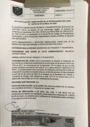 Notificaciones de TransitoNotificaciones de Transito 2022 Resolución No. 1-08723 Por Transito - 30 marzo, 2022 0 740 FacebookTwitterPinterestWhatsApp ACTA DE FIJACION Y DESFIJACION DEL AVISO COMPARENDOS 2022Descarga NOTIFICACION POR AVISO No. 1-08724 DEL 30 DE MARZO DEL 2022Descarga RESOLUCION No. 1-08723 DEL 30 DE MARZO DEL 2022 QUE ORDENA LA NOTIFICACION POR AVISODescarga