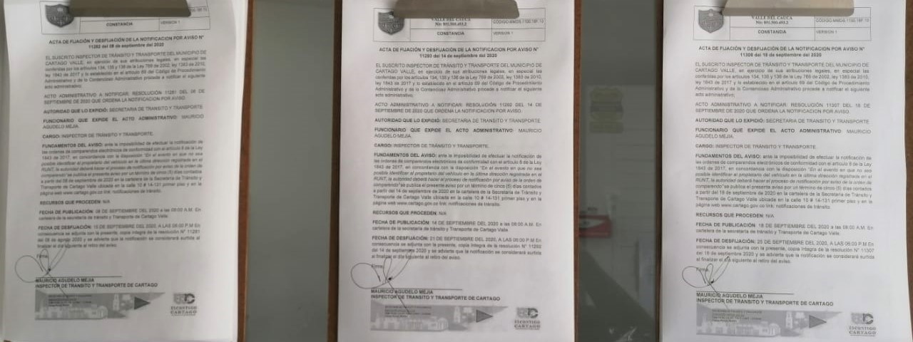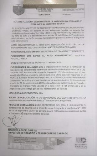 Notificaciones de TransitoNotificaciones de Transito 2020 Resolución No. 11307 Por Transito - 23 septiembre, 2020 0 832 FacebookTwitterPinterestWhatsApp RESOLUCION N 11307 DEL 18 DE SEPTIEMBRE DEL 2020 QUE ORDENA LA NOTIFICACION POR AVISO ACTA DE FIJACION Y DESFIJACION DEL AVISO COMPARENDOS 2020 NOTIFICACION POR AVISO N 11308 DEL 18 DE SEPTIEMBRE DEL 2020