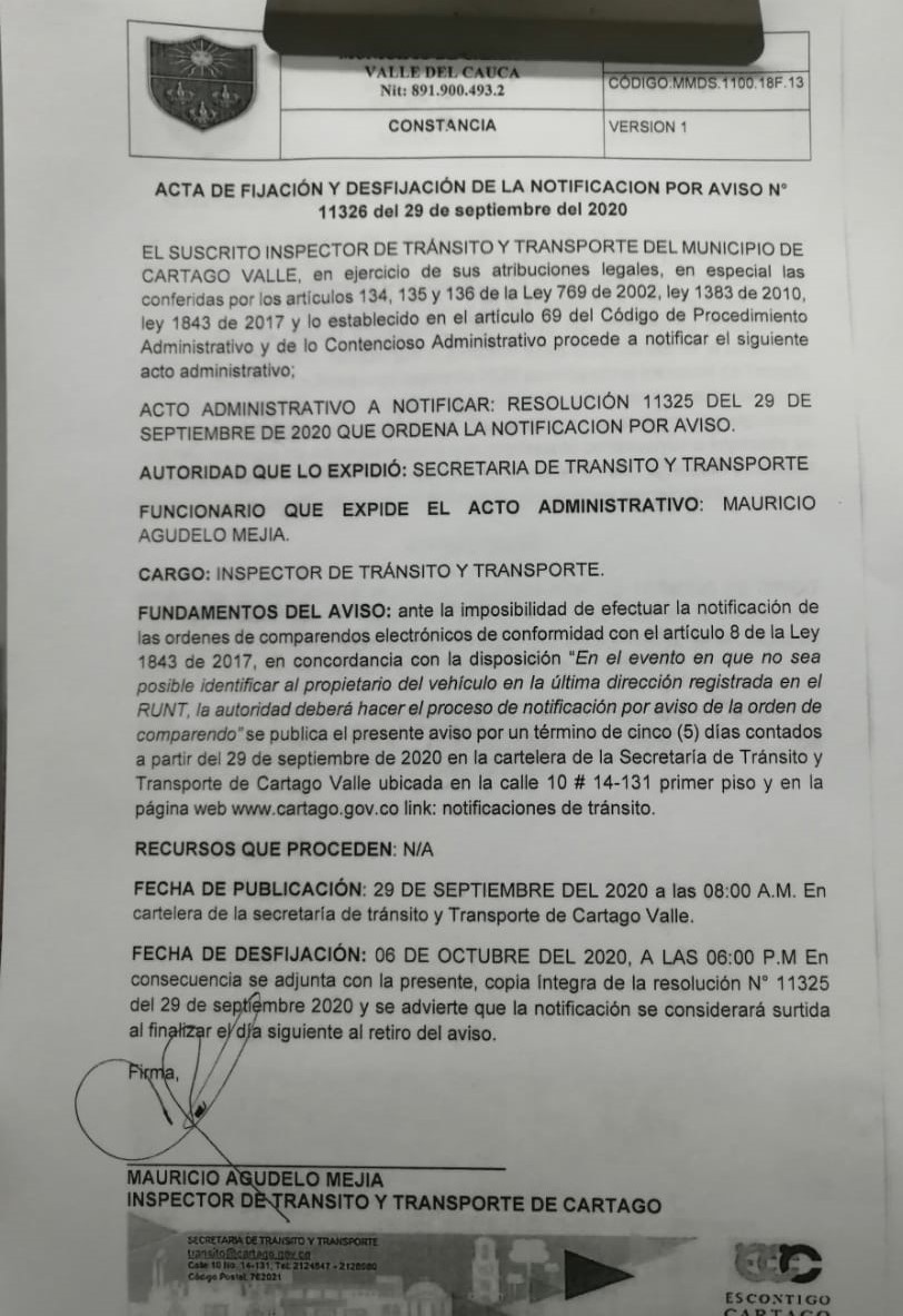 Notificaciones de TransitoNotificaciones de Transito 2020 Resolución No. 11325 Por Transito - 30 septiembre, 2020 0 881 FacebookTwitterPinterestWhatsApp RESOLUCION N 11325 DEL 29 DE SEPTIEMBRE DEL 2020 QUE ORDENA LA NOTIFICACION POR AVISO NOTIFICACION POR AVISO N 11326 DEL 29 DE SEPTIEMBRE DEL 2020 ACTA DE FIJACION Y DESFIJACION DEL AVISO COMPARENDOS 2020