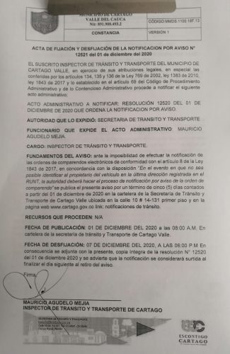 Notificaciones de TransitoNotificaciones de Transito 2020 Resolución No. 12520 Por Transito - 18 diciembre, 2020 0 875 FacebookTwitterPinterestWhatsApp RESOLUCION N 12520 DEL 01 DE DICIEMBRE DEL 2020 QUE ORDENA LA NOTIFICACION POR AVISODescarga NOTIFICACION POR AVISO N 12521 DEL 01 DE DICIEMBRE DEL 2020Descarga ACTA DE FIJACION Y DESFIJACION DEL AVISO COMPARENDOS 2020Descarga