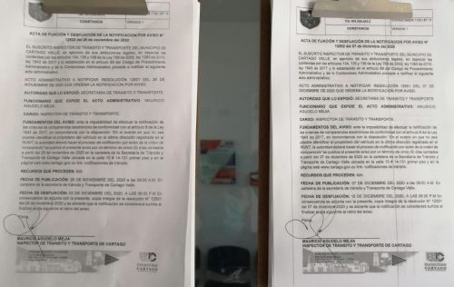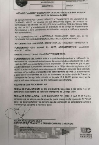 Notificaciones de TransitoNotificaciones de Transito 2020 Resolución No. 12551 Por Transito - 18 diciembre, 2020 0 1111 FacebookTwitterPinterestWhatsApp ACTA DE FIJACION Y DESFIJACION DEL AVISO COMPARENDOS 2020Descarga RESOLUCION N 12551 DEL 07 DE DICIEMBRE DEL 2020 QUE ORDENA LA NOTIFICACION POR AVISODescarga NOTIFICACION POR AVISO N 12552 DEL 07 DE DICIEMBRE DEL 2020Descarga
