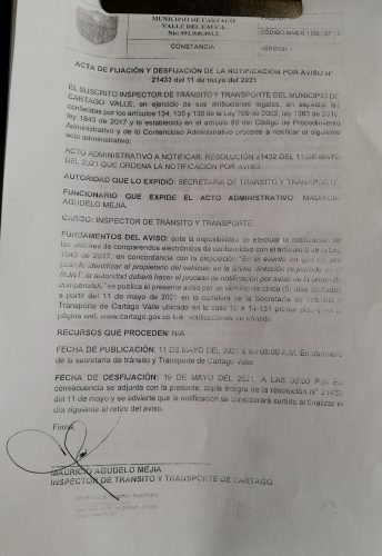 Notificaciones de TransitoNotificaciones de Transito 2021 Resolución No. 21432 Por Transito - 11 mayo, 2021 0 884 FacebookTwitterPinterestWhatsApp ACTA DE FIJACION Y DESFIJACION DEL AVISO COMPARENDOS 2021Descarga RESOLUCION N 21432 DEL 11 DE MAYO DEL 2021 QUE ORDENA LA NOTIFICACION POR AVISO (2)Descarga RESOLUCION N 21432 DEL 11 DE MAYO DEL 2021 QUE ORDENA LA NOTIFICACION POR AVISODescarga dav