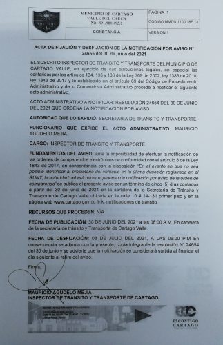 Notificaciones de TransitoNotificaciones de Transito 2021 Resolución No. 24654 Por Transito - 30 junio, 2021 0 748 FacebookTwitterPinterestWhatsApp ACTA DE FIJACION Y DESFIJACION DEL AVISO COMPARENDOS 2021Descarga NOTIFICACION POR AVISO N 24655 DEL 30 DE JUNIO DEL 2021Descarga RESOLUCION N 24654 DEL 30 DE JUNIO DEL 2021 QUE ORDENA LA NOTIFICACION POR AVISODescarga dav