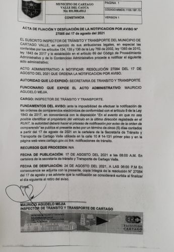 Notificaciones de TransitoNotificaciones de Transito 2021 Resolución No. 27084 Por Transito - 17 agosto, 2021 0 750 FacebookTwitterPinterestWhatsApp ACTA DE FIJACION Y DESFIJACION DEL AVISO COMPARENDOS 2021Descarga NOTIFICACION POR AVISO N 27085 DEL 17 DE AGOSTO DEL 2021Descarga RESOLUCION N 27084 DEL 17 DE AGOSTO DEL 2021 QUE ORDENA LA NOTIFICACION POR AVISODescarga dav