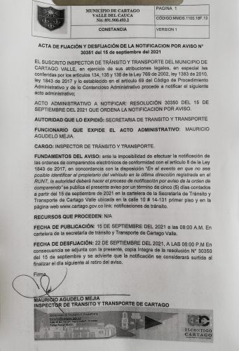 Notificaciones de TransitoNotificaciones de Transito 2021 Resolución No. 30350 Por Transito - 15 septiembre, 2021 0 754 FacebookTwitterPinterestWhatsApp ACTA DE FIJACION Y DESFIJACION DEL AVISO COMPARENDOS 2021Descarga NOTIFICACION POR AVISO N 30351 DEL 15 DE SEPTIEMBRE DEL 2021Descarga RESOLUCION N 30350 DEL 15 DE SEPTIEMBRE DEL 2021 QUE ORDENA LA NOTIFICACION POR AVISODescarga dav