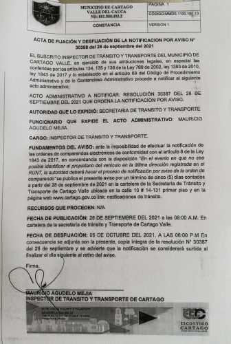 Notificaciones de TransitoNotificaciones de Transito 2021 Resolución No. 30387 Por Transito - 28 septiembre, 2021 0 748 FacebookTwitterPinterestWhatsApp ACTA DE FIJACION Y DESFIJACION DEL AVISO COMPARENDOS 2021Descarga NOTIFICACION POR AVISO N 30388 DEL 28 DE SEPTIEMBRE DEL 2021Descarga RESOLUCION N 30387 DEL 28 DE SEPTIEMBRE DEL 2021 QUE ORDENA LA NOTIFICACION POR AVISODescarga dav
