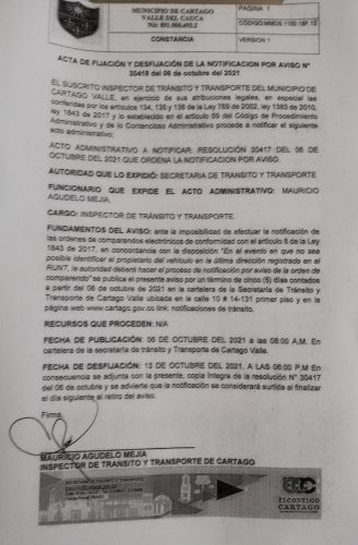 Notificaciones de TransitoNotificaciones de Transito 2021 Resolución No.30417 Por Transito - 6 octubre, 2021 0 639 FacebookTwitterPinterestWhatsApp ACTA DE FIJACION Y DESFIJACION DEL AVISO COMPARENDOS 2021Descarga NOTIFICACION POR AVISO N 30418 DEL 06 DE OCTUBRE DEL 2021Descarga RESOLUCION N 30417 DEL 06 DE OCTUBRE DEL 2021 QUE ORDENA LA NOTIFICACION POR AVISODescarga mde