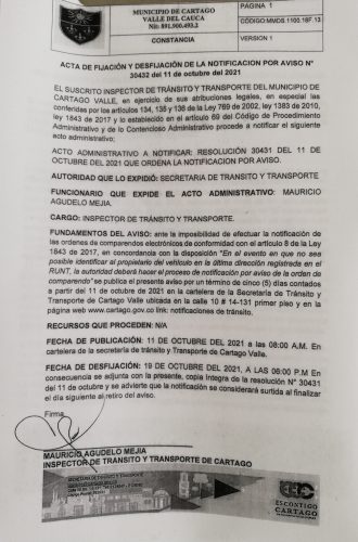 Notificaciones de TransitoNotificaciones de Transito 2021 Resolución No. 30431 Por Transito - 11 octubre, 2021 0 720 FacebookTwitterPinterestWhatsApp ACTA DE FIJACION Y DESFIJACION DEL AVISO COMPARENDOS 2021Descarga NOTIFICACION POR AVISO N 30432 DEL 11 DE OCTUBRE DEL 2021Descarga RESOLUCION N 30431 DEL 11 DE OCTUBRE DEL 2021 QUE ORDENA LA NOTIFICACION POR AVISODescarga dav