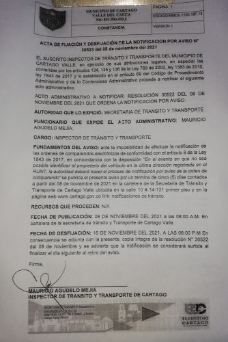 Notificaciones de TransitoNotificaciones de Transito 2021 Resolución No. 30522 Por Transito - 8 noviembre, 2021 0 778 FacebookTwitterPinterestWhatsApp ACTA DE FIJACION Y DESFIJACION DEL AVISO COMPARENDOS 2021Descarga NOTIFICACION POR AVISO N 30523 DEL 08 DE NOVIEMBRE DEL 2021Descarga RESOLUCION N 30522 DEL 08 DE NOVIEMBRE DEL 2021 QUE ORDENA LA NOTIFICACION POR AVISODescarga dav